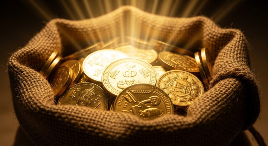 рд╡рд╣рд╛рдБ рдЙрд╕реЗ рдПрдХ рдкреБрд░рд╛рдиреА рдереИрд▓реА рдорд┐рд▓реАред рдЬрдм рдЙрд╕рдиреЗ рдЙрд╕реЗ рдЦреЛрд▓рд╛, рддреЛ рдЙрд╕рдореЗрдВ рд╕реЛрдиреЗ рдХреЗ рд╕рд┐рдХреНрдХреЗ рдереЗред